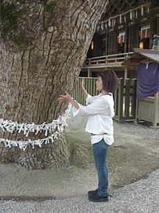 そし て登り切ったそこには、見事な桧皮葺の大社関棟造りの本宮が現れます。大物主神と崇徳天皇を祀る本殿には、確かに厳かな雰囲気が漂っています。すると先生は、本殿の横にそびえ立つ幹回り4.7m、高さ25mの楠の巨木に吸い寄せられるように近づくと…